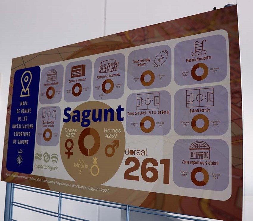 Por otro lado, como segunda acción de este programa se ha expuesto unos mapas de género sobre instalaciones deportivas de la ciudad de Sagunto. Estos mapas recogen el porcentaje de hombres, mujeres y personas no binarias que están inscritos en las actividades que se realizan en las instalaciones municipales. Esta información se puede ver en un mapa general que muestra la totalidad de los datos de las instalaciones, y en mapas con la información separada por cada uno de los recintos municipales.