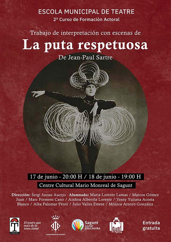 El 17 y 18 de junio será el turno del 2do curso, el 17 será a las 20 horas y el 18 a las 19 h. En esta ocasión representarán escenas de La puta respetuosa de Jean-Paul Sartre, en el Centro Cultural Mario Monreal de Sagunto.