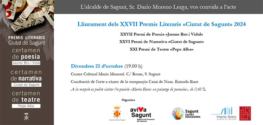 Los premios literarios Ciutat de Sagunt, organizados por el Gabinete de Promoción del Valenciano, llegan este año a la XXVII edición, un hito cultural dentro de la agenda de la ciudad que hay que destacar y celebrar. Los nombres de las personas ganadoras de esta edición, la más numerosa de la historia en cuanto a participación, se conocerán la tarde del 25 de octubre en el transcurso de un acto cultural muy especial de entrada libre en el Centro Cultural Mario Monreal, a las 19 horas, conducido por la compañía Camí de Nora y con la intervención de artistas de disciplinas diversas.