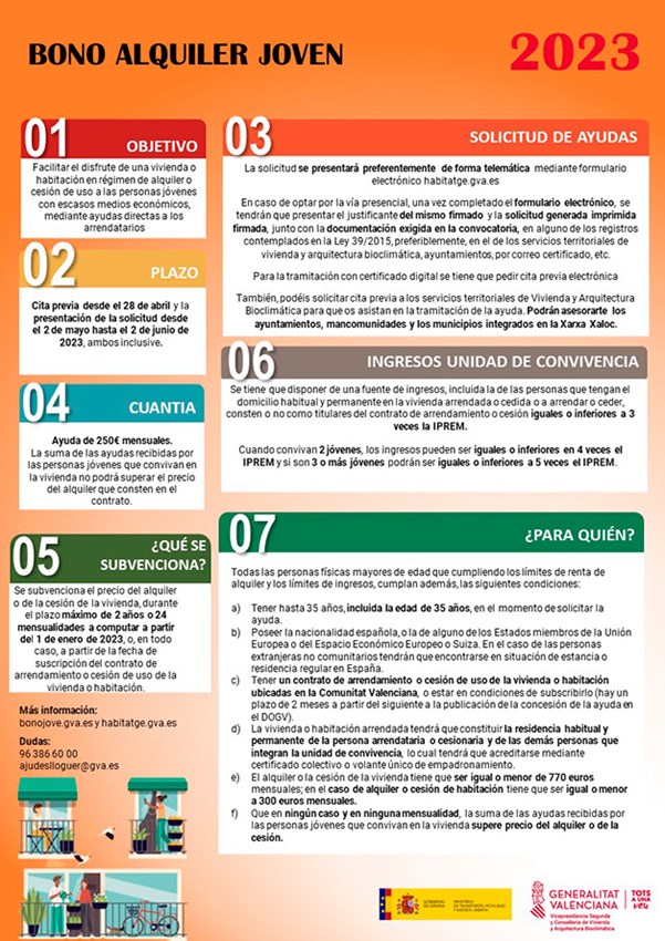 El Diario Oficial de la Generalitat Valenciana ha publicado la convocatoria de la Vicepresidencia Segunda y Conselleria de Vivienda y Arquitectura Bioclimática, relativa al Bono de Alquiler Joven para la edición 2023-24.