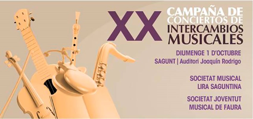 La Sociedad Musical Lira Saguntina y la Sociedad Juventud Musical de Faura ofrecerán un concierto el próximo domingo 1 de octubre, a las 12 horas, en el Auditorio Joaquín Rodrigo. Se trata de un concierto que forma parte de la campaña de intercambios musicales creada por la Federación de Sociedades Musicales de la Comunidad Valenciana (FSMCV). Ambas bandas compartirán escenario dentro de la XX Campaña de conciertos de intercambios.