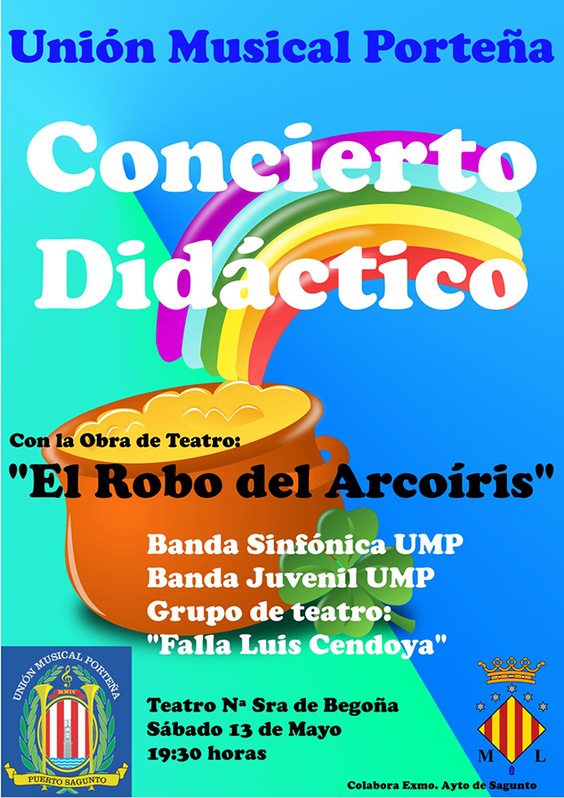 Como cada año, la Escuela pretende acercar a los más pequeños a la música. Un divertido concierto en el cual actuarán la Banda Sinfónica UMP, dirigida por Jorge Vivas Baquero y la Banda Juvenil UMP, dirigida por Raúl Domenech Rubio. Este año, habrá una sorpresa especial, la compañía de teatro local de la Falla Luís Cendoya colabora con la Escuela representando el cuento musical El Robo del Arcoíris, obra compuesta por Xavier Zamorano Alós.