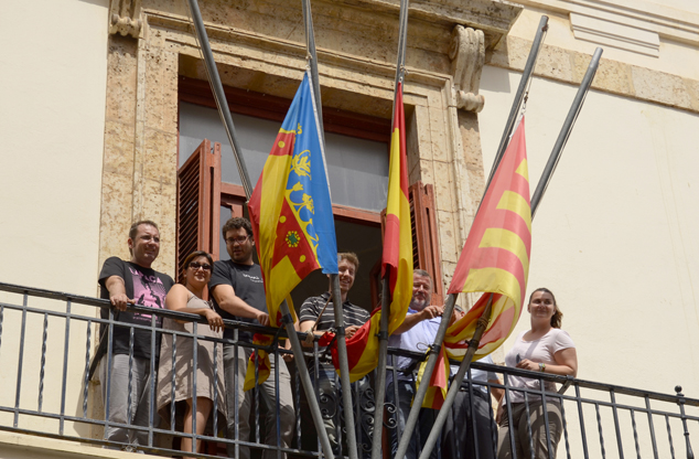 Las banderas del Ayuntamiento de Sagunto ondean a media asta por el 9º aniversario del accidente de metro de Valencia. El alcalde, Francesc Fernández, los concejales del Equipo de Gobierno, de Izquierda Unida, el PSOE, y Ciudadanos han rendido homenaje de esta forma a las víctimas del accidente.