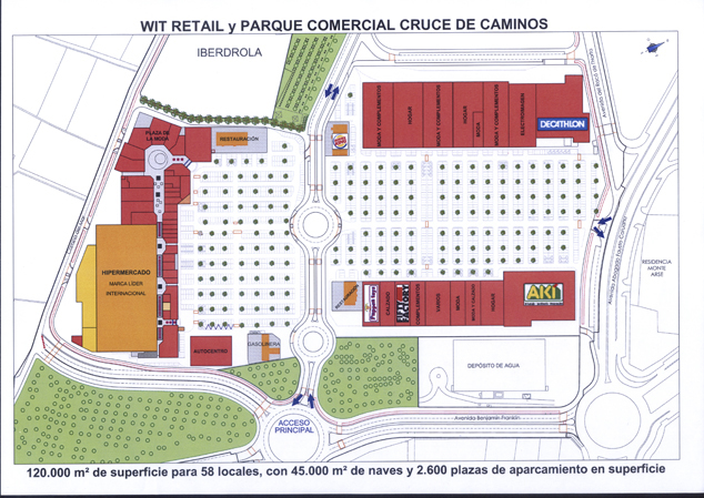 Las obras de esta gran área comercial comenzarán este mes de junio con los trabajos previos necesarios para la urbanización de una extensión total de parcela de 120.000 m2, de los que 20.000 m2 se destinarán al centro comercial y 25.000 m2 al parque comercial, según ha informado José Antonio García, de la empresa promotora Wit Retail. Esta área comercial y de servicios contará con 2.600 plazas de aparcamiento en superficie y la inversión total será de 90 millones de euros, de los que 50’3 serán aportados por la empresa promotora en la construcción y urbanización del propio parque y el resto, 39’7 millones es la inversión prevista en el acondicionamiento de las naves y locales para albergar su actividad comercial.