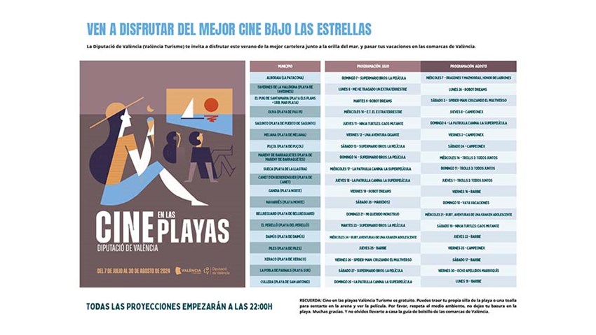 En cada una de las sesiones de cine se habilitará una pantalla hinchable especial para este tipo de proyecciones en entornos naturales y se retirará la misma noche tras la exhibición. Además, cerca del lugar de proyección se ubicará un punto de información turística con personal de atención al público y dos pantallas táctiles con información turística de toda la provincia, así como con vídeos promocionales de sus municipios. Estas acciones tienen el doble objetivo de ofrecer una oferta turística de ocio complementaria a la de sol y playa, y crear sinergias entre la costa y el interior con el público asistente, indican desde la Diputación.