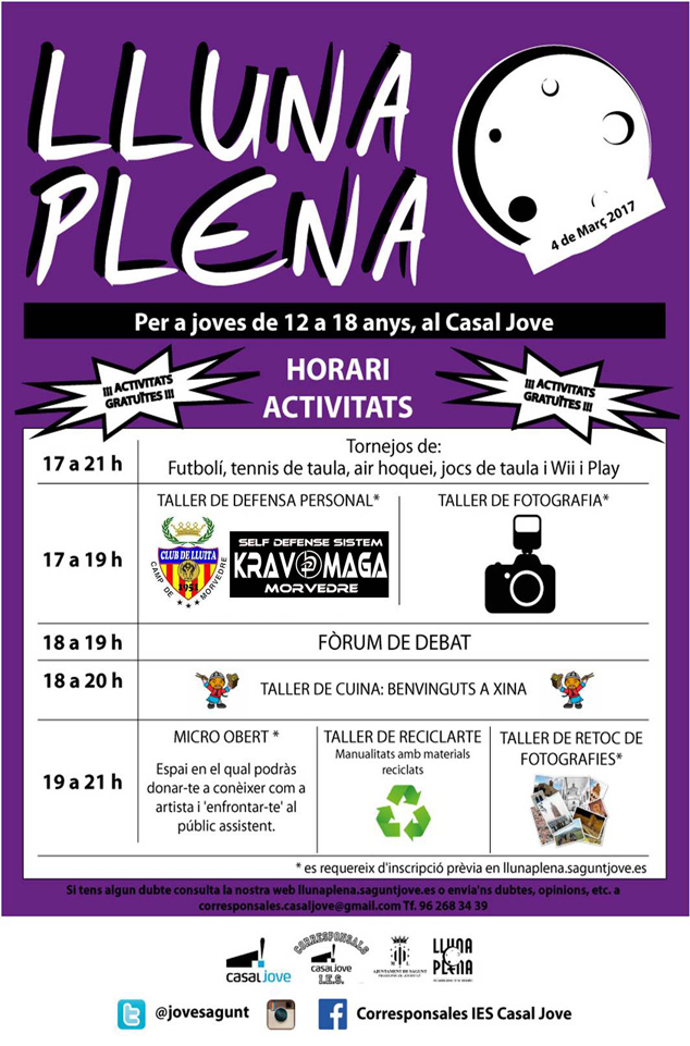 La información y la inscripción a estas actividades se pueden hacer de manera online en la página http://llunaplena.saguntjove.es/ y en el Facebook ‘Corresponsales IES Casal Jove’ o en Instagram @Jovesagunt.
