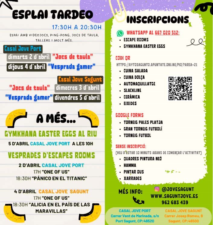 La inscripción ya está abierta y finaliza un día antes de empezar las actividades. Se realiza por la plataforma del Ayuntamiento, código QR o WhatsApp, aunque en algunas actividades solo será necesario presentarse 10 minutos antes del inicio de la actividad. Todas actividades son gratuitas, accesibles y variadas para dar respuesta a toda la población juvenil. Para mayor información sigue en Instagram a @jovesagunt, visita www.saguntjove.es, o contáctanos al 96 268 34 39.