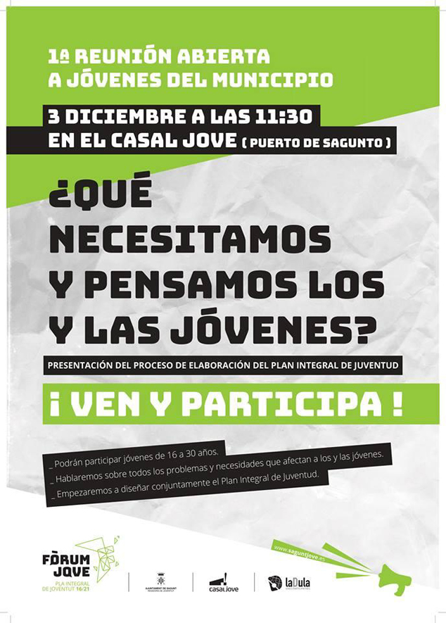 La primera de las reuniones abiertas del Fòrum Jove tendrá lugar el próximo sábado 3 de diciembre en el Casal Jove, a partir de las 11:30 horas. Estas reuniones tienen como objetivo diseñar conjuntamente el Plan Integral de Juventud 2016-21 y se enmarcan dentro del proceso protagonizado por el Grupo Impulsor de jóvenes de entre 16 y 25 años, dentro de la delegación de Juventud del Ayuntamiento de Sagunto.
