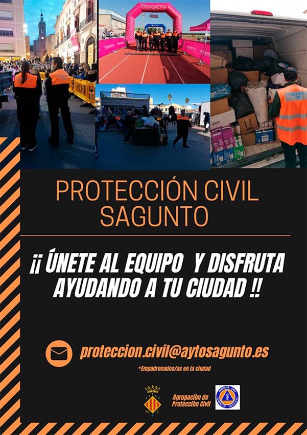 La agrupación de Protección Civil ha proporcionado un cartel que se difundirá por redes y en paneles informativos, donde aparece el correo proteccion.civil@aytosagunto.es, para que cualquier persona mayor de edad y empadronada en la ciudad pueda iniciar las gestiones para unirse como voluntario o voluntaria.