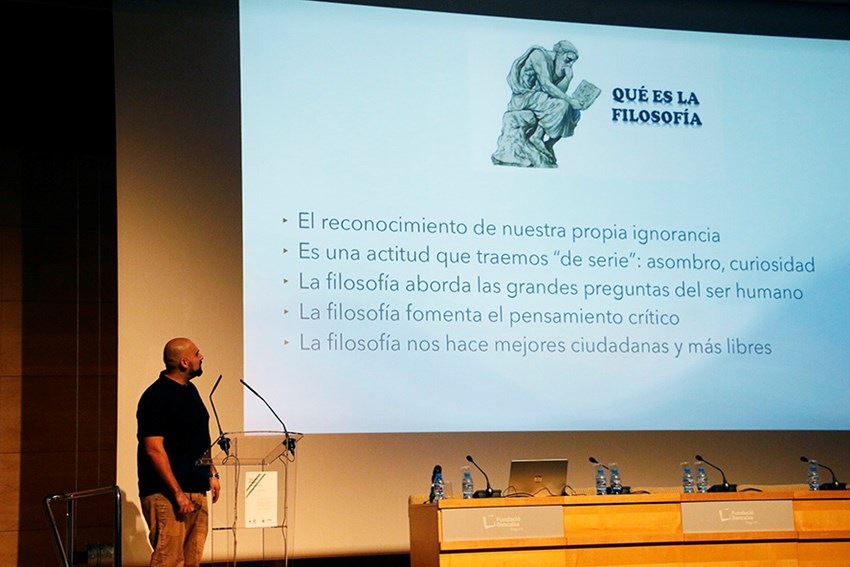 En la primera ponencia, el profesor Manuel Almagro defendió la necesidad de que la filosofía sea una rama del conocimiento humilde (sin las pretensiones del pasado) e interdisciplinar y para ello se sirvió del ejemplo de un suceso sociológico como la polarización (ideológica y/o afectiva) para ver cómo la filosofía ayuda a entender mejor nuestra realidad.