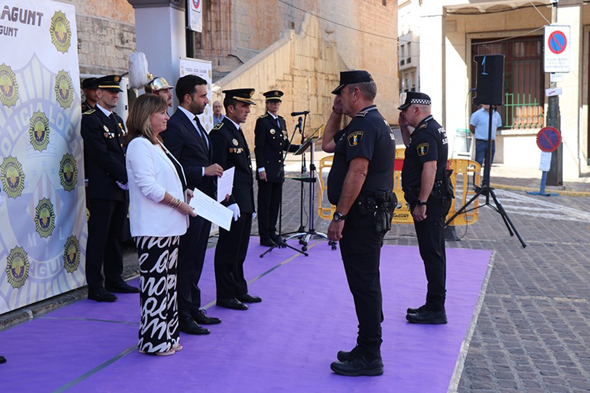 El alcalde de Sagunto, Darío Moreno, y el comisario de la Policía Local de Sagunto, Ricardo Luis March, han pasado revista a los agentes que se encontraban en formación. A continuación, junto a la delegada de la Policía Local, María José Carrera, han entregado las menciones y felicitaciones a los agentes.