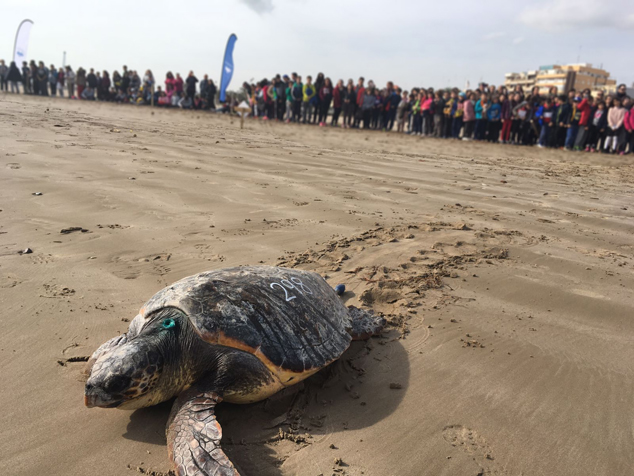 Más de 600 escolares del municipio de Sagunto, han acompañado hoy en su vuelta al mar a dos tortugas marinas recuperadas en el ARCA del Mar del Oceanogràfic de València. Las tortugas llevan un emisor incorporado para poder seguir su trayectoria una vez están en el mar, lo que aportará datos de gran interés a los científicos del Oceanogràfic que trabajan en la conservación de esta especie.