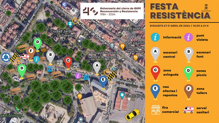 Respecto a los actos programados para el 27 de abril, la zona infantil estará operativa de 10.30 a 13.30 horas y de 17 a 20 horas, y contará con zona de animación, hinchables, talleres de chapas, pinta caras… Además, a las 10 horas habrá una visita guiada al Horno Alto, para la que es necesaria inscripción previa: https://www.eventbrite.es/e/visita-festa-aniversari-40-anys-de-la-resistencia-tickets-875787573207. A las 11 horas, estará el cuentacuentos “Tod@s a un@” en la Gerencia y una visita virtual por la antigua fábrica en la Nave de Efectos y Repuestos a cargo de APIPS. A las 11.30 horas, habrá una exhibición de baile a cargo del Club de la Vida Puerto y una visita guiada a la Gerencia. A las 12.15 horas, en la zona de la Nave de Efectos y Repuestos, habrá una mesa redonda llamada “La segunda batalla de AHM o la ciudad que venció al ladrillo”, organizada por AMIMO. En la Gerencia, a las 12.30 horas, será el concierto de Ñ Rock.