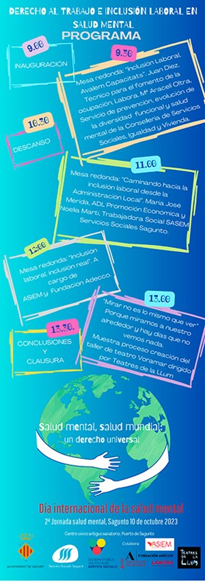 La Concejalía de Servicios Sociales celebrará la 2a Jornada de la Salud Mental en Sagunto durante la mañana del 10 de octubre, fecha que coincide con el Día Mundial de la Salud Mental. Esta iniciativa tendrá lugar en el Centro Cívico Antiguo Sanatorio bajo el lema ‘Salud Mental, Salud Mundial, Un Derecho Universal’ y la temática de este año es ‘Derecho al Trabajo e Inclusión Laboral en Salud Mental’.