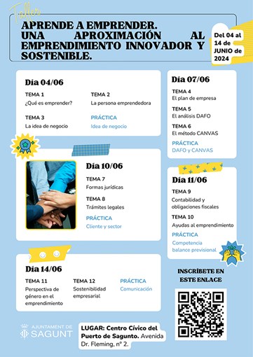 El Ayuntamiento de Sagunto, a través del departamento de Universidad, Ciencia e Innovación, comenzará la próxima semana el curso de emprendimiento ‘Aprende a emprender. Una aproximación al emprendimiento innovador y sostenible’. El curso se iniciará el próximo 4 de junio y se realizará en cinco sesiones de 10 a 14 horas en el Centro Cívico de Puerto de Sagunto.