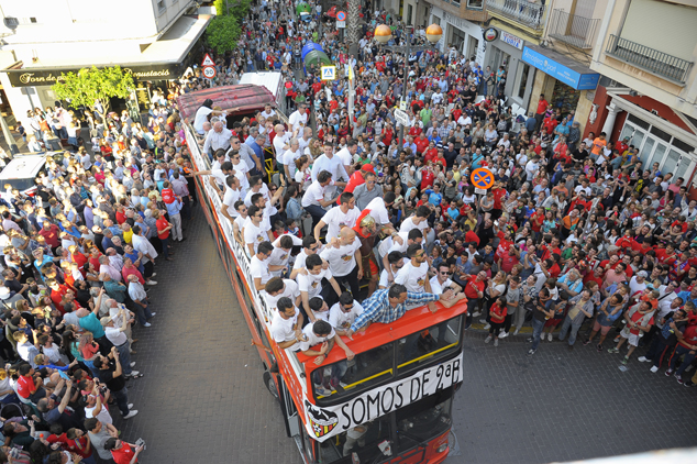 Durante la celebración, el alcalde de Sagunto dio las gracias a los jugadores, cuerpo técnico y directiva por hacer posible uno de los días más felices de la ciudad. El alcalde que también se desplazó hasta Calahorra dijo que “nunca había vivido nada parecido”. Y apuntó que ahora los que deben estar a la altura son el Equipo de Gobierno para “que la ciudad esté donde se merece”. Más tarde, la celebración se trasladó al Terraet de la Glorieta donde habló todo el equipo ante los cánticos de la afición y del “Frente Romano”.