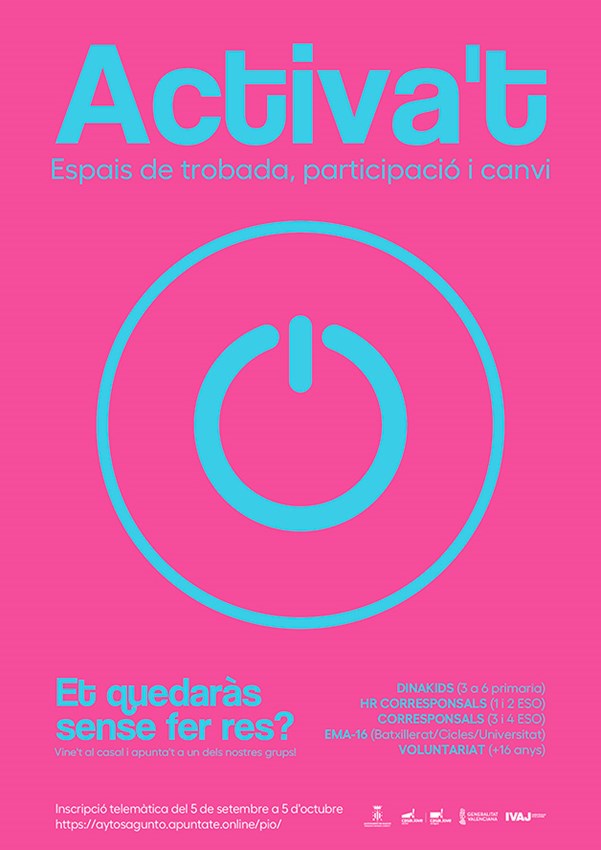 La inscripción en los Grupos de Participación se abrió el pasado 5 de septiembre de 2023 hasta el 5 de octubre de 2023. Asimismo, el plazo para la inscripción de los Grupos de Participación en el programa Actíva’t también finalizará el 5 de octubre de 2023. Las personas interesadas pueden completar su solicitud en línea en la plataforma del Ayuntamiento e inscripción en línea: https://aytosagunto.apuntate.online/pio/.