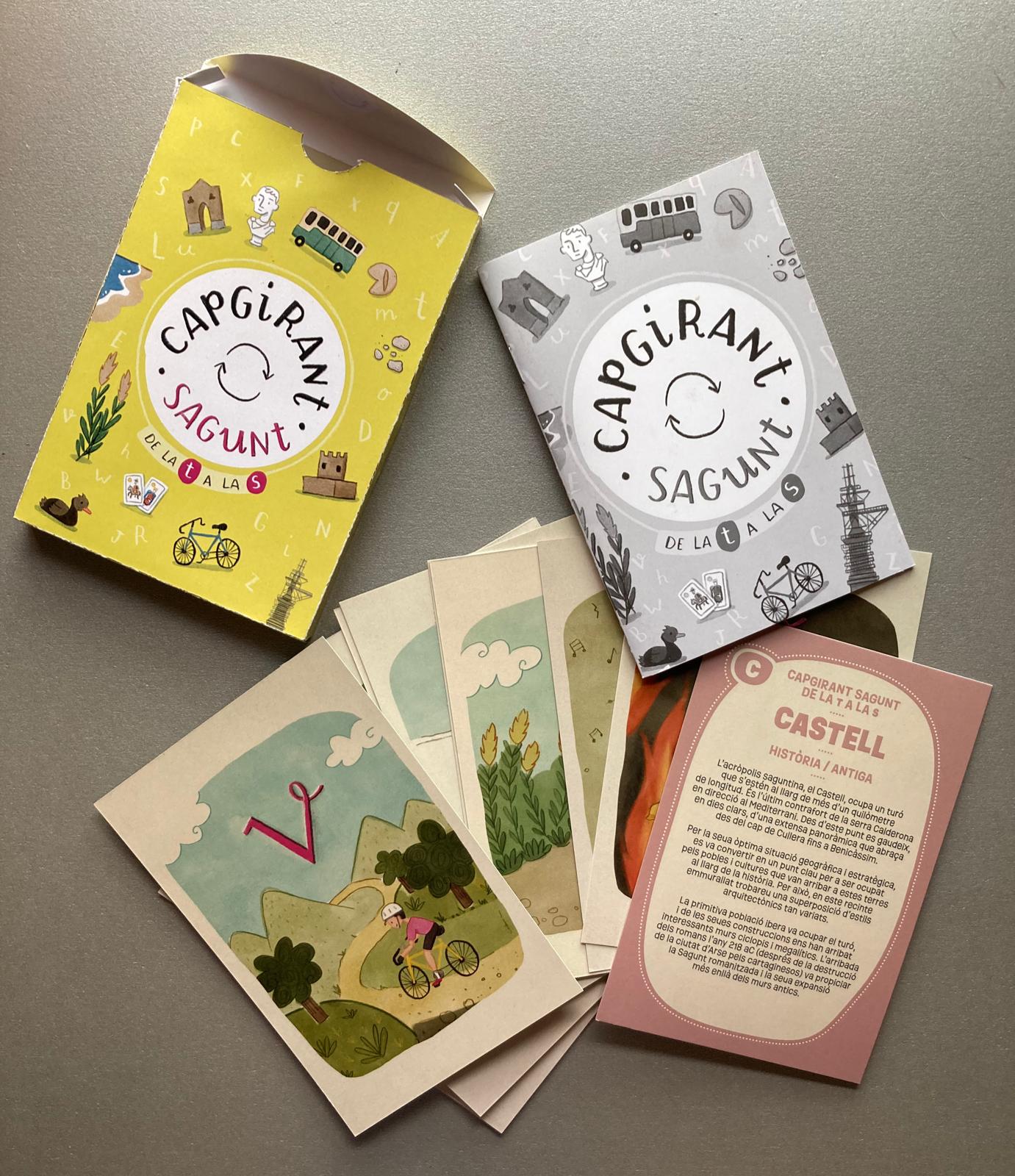 Les cartes-vocabulari estan dividides en cinc parts diferenciades per colors: Història, marró; Identitat, taronja; Medi Ambient, verd; Ciutat, blau, i Personatge, roig. Es poden utilitzar com a guia o emprant les activitats, també interactives, que l’acompanyen al web https://bit.ly/capgirantsagunt. Les activitats proposades son LÍNIA DEL TEMPS on podrem situar totes les cartes en una línia del temps que ha d’anar des del 219 aC fins a l’any 2022, SITUAR EN EL MAPA on podrem situar totes les cartes en un mapa de la ciutat per poder identificar espais amb les representacions de les cartes, EL TEMPS S’HA ACABAT on podrem descobrir totes les cartes i poder explicar-les d’una manera diferent cada vegada, REESCRIU LA HISTÒRIA on podrem fomentar la creativitat i poder fer servir l’explicació que han rebut sobre cada una de les cartes, així com JOC DE DESCOBERTA entre d’altres.