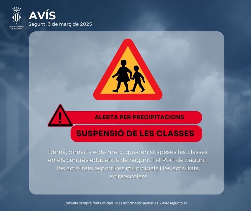 Al llarg de les pròximes hores, els ajuntaments del Camp de Morvedre faran seguiment de les previsions meteorològiques i les possibles alertes decretades per la Generalitat Valenciana per a establir si la suspensió es manté per al dimecres 5.