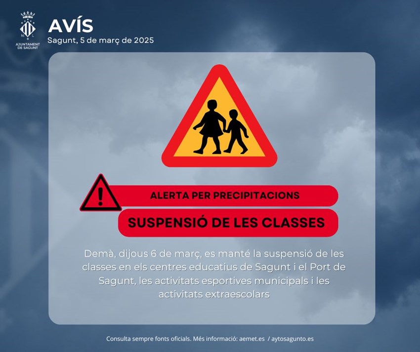 A més, l'Ajuntament de Sagunt ha ajornat les activitats culturals previstes i mantindrà tancada la biblioteca Cronista Chabret durant esta vesprada.