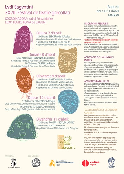 Els Lvdi Saguntini rememoraran el passat clàssic de la ciutat des del dilluns 7 al divendres 11 d'abril amb diversos tallers didàctics de cultura clàssica, així com amb la XXVIII edició del Festival de Teatre Grecollatí en la qual es representaran nou obres en el Teatre Romà de Sagunt. Durant estos dies, milers d'estudiants de la ciutat, però també d'altres llocs d'Espanya gaudiran aprenent dels diversos tallers de cultura clàssica i de les obres de teatre interpretades per grups d'estudiants.