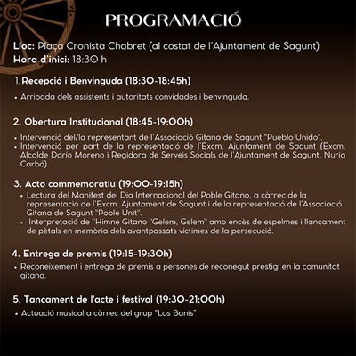 La comunitat gitana del municipi de Sagunt commemorarà este divendres, 4 d'abril, el Dia Internacional del Poble Gitano (8 d'abril), amb un acte que tindrà lloc a la plaça Cronista Chabret des de les 18.30 fins a les 21 hores i que inclourà actes oberts al públic. Així mateix, es commemorarà també el 600 aniversari de l'arribada del poble gitano a Espanya. La gala està organitzada per l’Associació Gitana Pueblo Unido amb la col·laboració de l’Ajuntament de Sagunt.