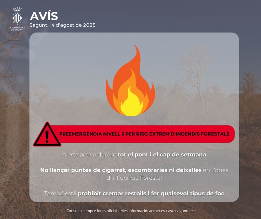 L'alerta per calor extrema, derivada de l'onada de calor que afecta Sagunt i el litoral nord de la província de València, s'ha elevat a taronja (risc important) per a este dijous, 14 d'agost, i s'espera que es mantinga així la resta del cap de setmana. Esta alerta estarà activa hui, dijous 14 d'agost, fins a les 19.59 hores i la resta de dies del pont i del cap de setmana des de les 12:00 fins a les 19.59 hores.