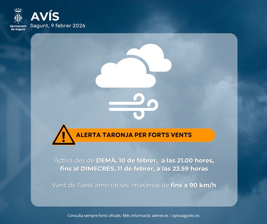 El 112 Comunitat Valenciana i AEMET han elevat a nivell taronja (risc important) l'alerta per vents en el litoral nord de la província de València. S'esperen vents generalitzats de component oest que puntualment podrien arribar als 90 quilòmetres per hora. Segons AEMET, l'alerta és des de les 21 hores del dimarts 10 de febrer fins a les 23.59 hores del dimecres dia 11.