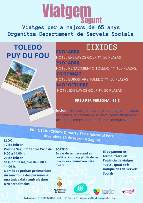 El viatge inclou transport amb autobús des de Sagunt i tots els trasllats, entrada al parc amb dinar i sopar, assistència a l'espectacle nocturn El Sueño de Toledo, allotjament en hotel en règim d'allotjament i desdejuni, visita lliure per Toledo i el menjar del segon dia. El preu total és de 65 euros, que haurà d'abonar-se en l'agència de viatges GEO quan així ho indique el departament de Serveis Socials.