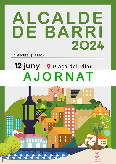 L'Ajuntament de Sagunt anuncia que l'edició d'Alcalde de Barri prevista per a hui a les 19 hores a plaça del Pilar del barri La Palmereta queda ajornada. El motiu són les condicions meteorològiques que estan havent-hi a la ciutat en el dia de hui, ja que és un esdeveniment que se celebra a l'aire lliure.