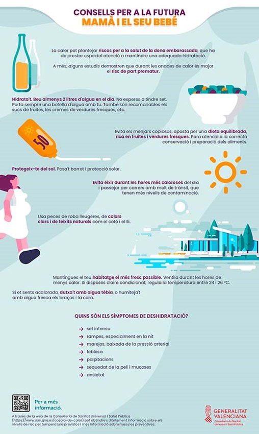 Actualment, la zona de Sagunt no es troba en un risc alt per la calor. No obstant això, des de la regidoria de Sanitat de l'Ajuntament de Sagunt s'oferixen una sèrie de consells i recomanacions a la ciutadania per a combatre els efectes de les altes temperatures. Concretament en este cas, per a les dones embarassades, els xiquets i les xiquetes de bolquers i les persones majors. Alguns estudis, fins i tot, demostren que durant les onades de calor és major el risc de part prematur.