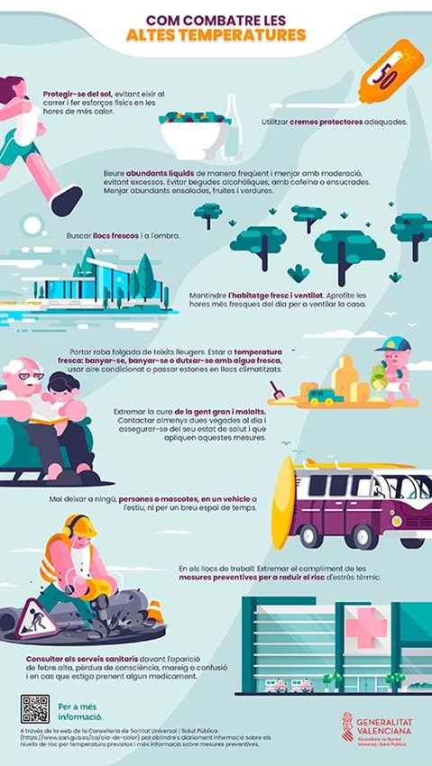 Així mateix, s'aconsella mantindre l'habitatge el més fresc possible, ventilant durant les hores de menys calor. La temperatura recomanada de l'aire condicionat és entre 24 i 26 graus. En cas de sentir molta calor, s'aconsella dutxar-se amb aigua tèbia o humitejar amb aigua fresca els braços i la cara.