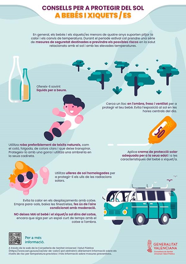 En el cas dels nadons i xiquets i xiquetes de menys de 4 anys, estos suporten pitjor la calor i els canvis de temperatura. Cal oferir-los sovint líquids per a beure, així com buscar un lloc en l'ombra, fresc i ventilat per a protegir els nadons, evitant l'exposició al sol en les hores centrals del dia. La roba de teixits naturals, folgada, de colors clars i que deixe transpirar també ajuda a protegir els més xicotets de la calor. S'ha d'aplicar la crema de protecció solar adequada per a la seua edat i les seues característiques i utilitzar ulleres de sol homologades. En els viatges, s'aconsella emprar para-sols, baixar les finestretes i fer ús de l'aire condicionat amb moderació. A més, en cap cas s'haurà de deixar el nadó o el xiquet o xiqueta sol dins del cotxe, encara que siga poc de temps i a l'ombra.