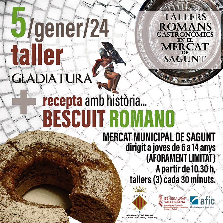 El divendres, 5 de gener, el Mercat Municipal de Sagunt acollirà cada mitja hora a partir de les 10.30 hores tres tallers de gladiatura que consistiran en la realització del bescuit romà, l'aforament del qual serà limitat.