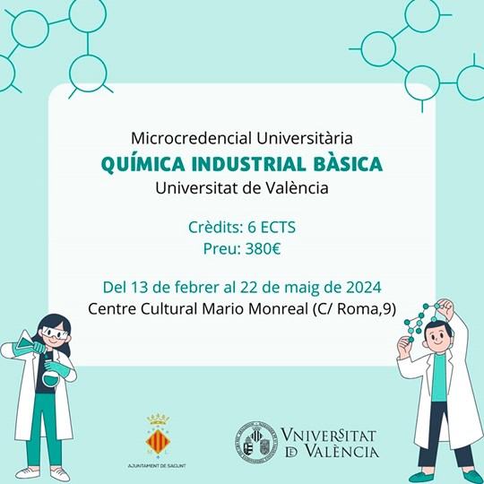 L'Ajuntament de Sagunt i la Universitat de València posen en marxa el curs "Microcredencial Universitària en Química Industrial Bàsica", un programa de formació per a tota la població i amb el qual es pretén millorar la inserció laboral. Les microcredencials són cursos especialitzats dissenyats per a cobrir necessitats de formació per a tota mena de professionals; en este cas, per a professionals que compten prèviament amb estudis de batxillerat, formació professional i/o titulats en ciències bàsiques i afins.