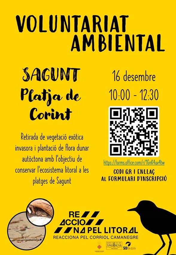 Dissabte que ve, 16 de desembre, de 10.00 a 12.30 hores, torna el voluntariat ambiental Reacciona pel Litoral a les platges de Sagunt. En esta ocasió a la platja de Corinto, per a continuar amb la retirada de vegetació exòtica invasora i la plantació de flora dunar autòctona, amb l'objectiu de conservar l'ecosistema i protegir l'hàbitat del corriol camanegre, una espècie amenaçada i protegida del nostre litoral costaner.