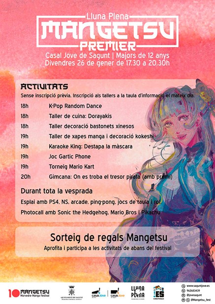 La regidoria de Joventut i Infància promou el Lluna Plena Premier Mangetsu com a prèvia al Festival Mangetsu de Sagunt. L'esdeveniment es durà a terme el divendres 26 de gener de 17.30 a 20.30 hores al Casal Jove de Sagunt. Durant la vesprada es faran diverses activitats destinades als i les joves de més de 12 anys perquè se submergisquen de ple en el món de la cultura asiàtica i la diversió.