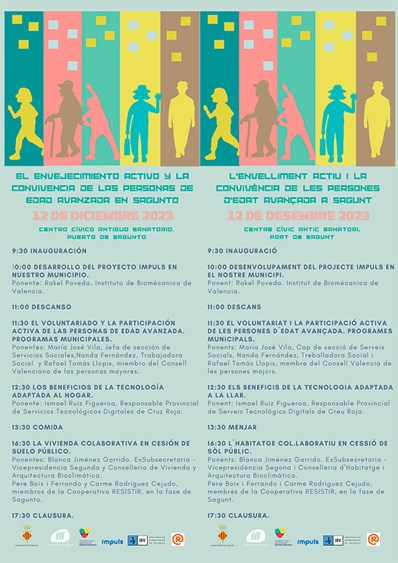 La inauguració de la jornada serà a les 9.30 hores. «És important ressaltar que es presentarà el desenvolupament del projecte Impuls de l'Institut de Biomecànica de València», a càrrec de Rakel Poveda, assenyala Nuria Carbó. També es presentaran els programes municipals de voluntariat i participació activa de les persones d'edat avançada, per part de María José Vila, Nanda López i Rafel Tomás; i es finalitzarà el matí amb una ponència sobre els beneficis de la tecnologia adaptada a la llar, a càrrec d'Ismael Ruiz. Després, a la vesprada, a les 16.30 hores es parlarà sobre l'habitatge col·laboratiu en cessió de sòl públic.