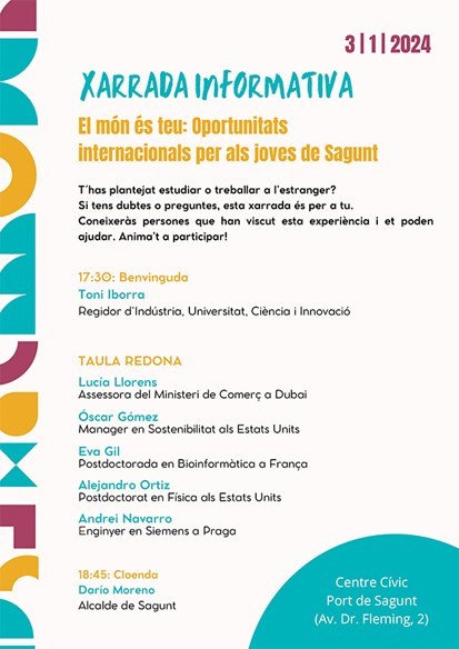 Este pròxim 3 de gener, la sala d'actes del Centre Cívic Antic Sanatori del Port de Sagunt acollirà a partir de les 17.30 hores la xarrada informativa "El món és teu: Oportunitats internacionals per als joves de Sagunt". La xarrada està organitzada per la regidoria d'Indústria, Universitat, Ciència i Innovació de l’Ajuntament de Sagunt, i estarà oberta a la participació de tota la ciutadania. L'entrada serà gratuïta fins a completar l'aforament.